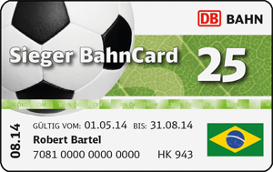 Vom 01.05. bis 26.06.2014 verkauft die DB AG die "Sieger BahnCard 25" zum Preis von EUR 25 (2. Kl.) resp. EUR 50 (1. Kl.). Die "Sieger BahnCard 25" gewährt ab Kauf für 4 Monate die Eigenschaften der normalen BahnCard 25: 25 % Ermässigung auf den Normalpreis und die Sparpreise für innerdeutsche Fahrten, RailPlus bei grenzüberschreitenden Fahrten, City-Ticket-Funktion in 123 Städten und Sammeln von bahn.bonus-Prämienpunkten. Nach Ablauf von vier Monaten geht die "Sieger BahnCard 25" in ein reguläres BahnCard 25-Abo über, wenn sie nicht spätestens sechs Wochen vor Laufzeitende gekündigt wird.
