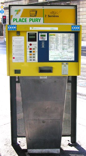 Bedienung: Haltestellenverzeichnis mit Farbcode und entsprechend farbiger Taste. Anleitung Französisch.