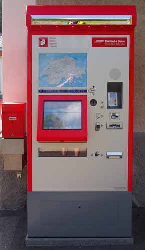 Zahlungsmöglichkeiten: CH- und EUR-Bargeld (Noten bis CHF 200/EUR 200), Kreditkarten, Postcard, Reka-Checques, Reka-Rail. Automat gibt Retourgeld (bis CHF 99.90) auch in CH-Noten aus.