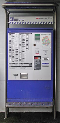 Bedienung: Tasten für Eingabe der Haltestellen- und Zonencodes sowie die Wahl von 1. Klasse, Rückfahrkarte und Halbpreis. Bedienerführung mit Anleitung, Tabelle der Haltestellencodes, Zonenplan und Hinweisen in der Anzeige.
