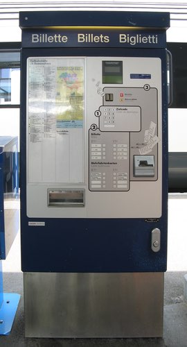 Bedienung: Tasten für Eingabe der Haltestellen- und Zonencodes sowie die Wahl von 1. Klasse, Rückfahrkarte und Halbpreis. Bedienerführung über Zahlenabfolge auf der Frontplatte, Tabelle der Haltestellencodes, Zonenplan und Hinweisen in der Anzeige.