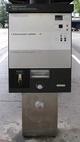 Galerie Billettautomaten Schweiz 99/103 Verkehrsbetriebe St. Gallen (VBSG)Hersteller: Autelca.Sortiment: Einzelbillett, Tageskarten.Zahlungsmöglichkeiten: CH-Münzen.Bedienung: Tasten für Art und Tarifstufe. Anleitung Deutsch.(Hauptbahnhof, 12.09.2004)
