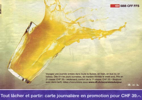 Galerie Herbstaktion Schweiz 20/21 2005: Die Werbung zur Herbstaktion "Sofort alles fallen lassen", hier in französischer Sprache und einem fallenden Glas. Das Angebot war nur für Halbtax-Abonnenten erhältlich.