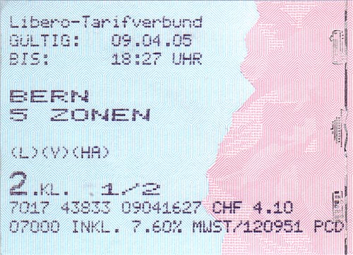 Galerie Tarifverbund Libero (Region Bern / Solothurn) 3/11 Einzelbillett für eine Fahrt über 5 Zonen, ausgegeben aus einem BATS und bezahlt mit PostCard.