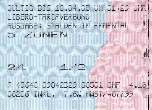 Galerie Tarifverbund Libero (Region Bern / Solothurn) 4/11 Einzelbillett für eine Fahrt über 5 Zonen, ausgegeben aus einem Ascom-Automaten.