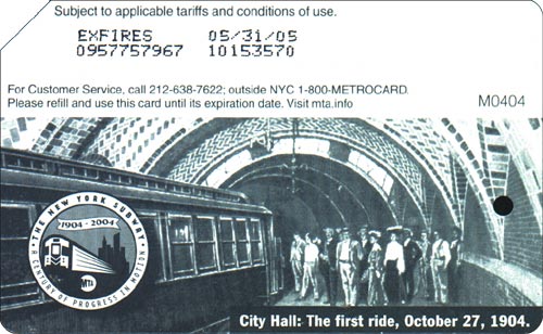 Galerie MetroCards New York 21/26 Jubiläumskarte 100 Jahre Subway. Bild vom ersten Zug in der Station "City Hall" am 27. Oktober 1904.