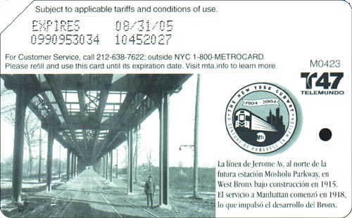 Galerie MetroCards New York 23/26 Jubiläumskarte 100 Jahre Subway. Bild der "el"-Linie (für elevated) mit Legende in Spanisch.