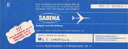 Galerie Flugscheine 7/10 Sabena-Flugschein von 1974. (Sabena war von 1923 bis 2001 die staatliche Fluggesellschaft Belgiens.)