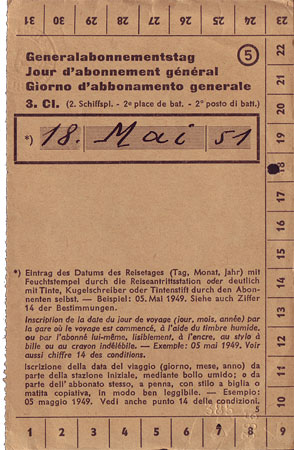 Galerie Tageskarten Schweiz 1/16 Tageskarte für 3. Klasse (2. Klasse auf Schiffen) aus dem Jahre 1951, damals noch Generalabonnementstag genannt. Bei der ersten Kontrolle wurde der Monatstag im entsprechenden Feld am Fahrkartenrand gelocht. 5. Tageskarte aus dem Tageskartenheft.