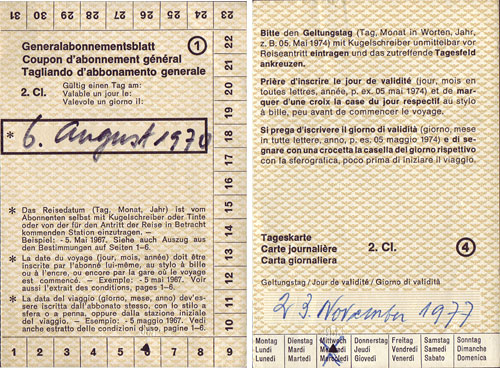 Galerie Tageskarten Schweiz 2/16 Tageskarten für 2. Klasse von 1970, respektive 1977. Auf der Variante von 1977 steht jetzt bereits "Tageskarte" und anstelle der Monatstage wird der Wochentag entwertet.