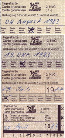 Tageskarten 2. Klasse zum Halbtax-Abonnement, gebraucht in der Zeit von 1983-1987. Da die Tageskarten im Set gekauft wurden und auch nach Preiserhöhungen gültig waren, entspricht der Preis nicht unbedingt dem am Nutzungstag aktuellen Preis. Bei der Variante von 1987 wurde am Rand wie bereits früher wieder der Monatstag gelocht, jetzt aber mit separaten Zehnereinheiten.