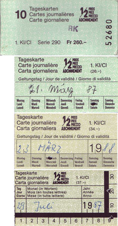 Tageskartenheft (oben) und Tageskarten 1. Klasse zum Halbtax-Abonnement. Das Tageskartenheft wurde mit Reka-Cheques bezahlt (Stempel "RK"). Da die Tageskarten im Set gekauft wurden und auch nach Preiserhöhungen gültig waren, entspricht der Preis nicht unbedingt dem am Nutzungstag aktuellen Preis. So wurde die 1988 genutzte Karte 1983 gedruckt, die unterste trotz früherer Nutzung 1985.