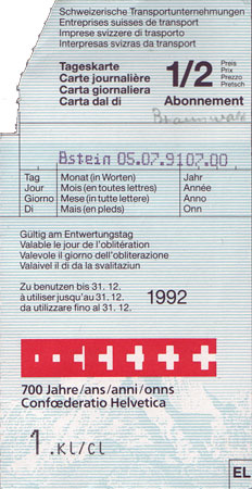 Galerie Tageskarten Schweiz 12/16 Zum Jubiläum 700 Jahre Schweizer Eidgenossenschaft gab es 1991 eine Tageskarte im speziellen Layout.