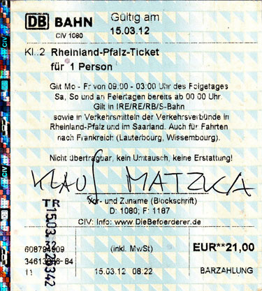 Galerie Ländertickets Deutschland 17/19 Rheinland-Pfalz-Ticket für eine Person nach dem seit 12.12.2010 gültigen Preisschema Grundpreis 1. Person EUR 21, jede weitere (bis 5 Personen) EUR 4 zusätzlich.