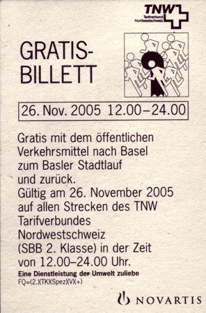 Teilnehmer am Basler Stadtlauf erhalten am Veranstaltungstag freie Fahrt mit den öffentlichen Verkehrsmitteln im Tarifverbund Nordwestschweiz (TNW). 2005 noch ab 12 Uhr, später auf 10 Uhr ausgedehnt. Das Pharmaunternehmen Novartis unterstützt die Nutzung des öV durch die Läufer.