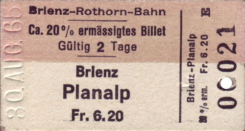 Galerie Brienz–Rothorn-Bahn 28/50 Auch die "ca. 20 %" ermässigten Billette hat es für einfache Fahrten gegeben.
