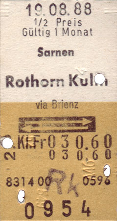 Galerie Brienz–Rothorn-Bahn 39/50 Rückfahrkarte von 1988 zum halben Preis für eine Fahrt von Sarnen mit der Brünigbahn nach Brienz und Weiterfahrt mit der Brienz-Rothorn-Bahn. Ausgegeben mit Pautze-Drucker in Sarnen.