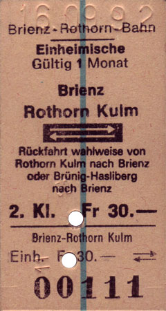 Galerie Brienz–Rothorn-Bahn 23/50 Rückfahrkarte von 1992 für die Gesamtstrecke zum Einheimischentarif. Die vertikale blaue Linie ist zu dieser Zeit das allgemeine Kennzeichen von Fahrkarten für Einheimische.