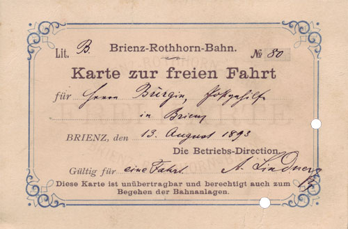 Galerie Brienz–Rothorn-Bahn 1/50 Freifahrkarte aus dem zweiten Jahr des Betriebs (1893) der Brienz-Rothorn-Bahn. Interessant der Vermerk, dass die Karte auch das Begehen der Bahnanlagen erlaubt.