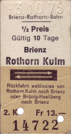 Galerie Brienz–Rothorn-Bahn 4/50 Rückfahrkarte von 1975 zum halben Preis. Drei Jahre früher kostete die gleiche Fahrt noch drei Franken weniger.