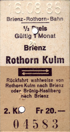 Galerie Brienz–Rothorn-Bahn 6/50 Rückfahrkarte von 1985 zum halben Preis. Zehn Jahre früher kostete die gleiche Fahrt noch CHF 13.