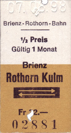 Galerie Brienz–Rothorn-Bahn 10/50 1998 waren bei der Brienz Rothorn Bahn noch Edmondsons im Einsatz. Die wahlweise Rückfahrt ab Brünig Hasliberg bestand jedoch nicht mehr.