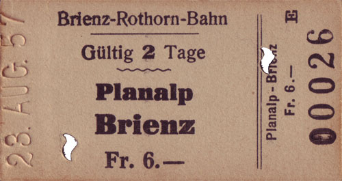 Galerie Brienz–Rothorn-Bahn 11/50 Die Fahrkarten für einfache Fahrt wurden in der Regel im Querformat gedruckt. Fahrkarte von der Mittelstation Planalp hinunter nach Brienz.