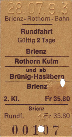 Rundfahrtbillett von 1993 zum Normalpreis. Wie bereits erwähnt, waren auch die normalen Rückfahrkarten in der Regel zur Rückfahrt ab Brünig Hasliberg gültig. Wenn man jedoch schon sicher war, dass man die Wanderung nach Brünig-Hasliberg unternimmt und von dort zurückfährt, so war das Rundfahrtbillett günstiger und est noch zwei Tage gültig, d.h. man konnte z.B. auch noch im Kulm-Hotel übernachten.