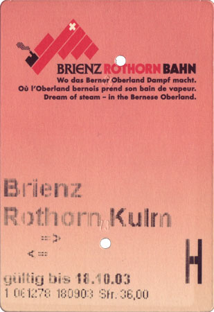 Galerie Brienz–Rothorn-Bahn 45/50 Über das Skidata-System ausgegebene Rückfahrkarte für Halbpreisberechtigte.
