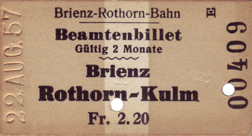 Galerie Brienz–Rothorn-Bahn 24/50 Wie die anderen Fahrkarten für einfache Fahrt wurden auch die Beamtenbillette für einfache Fahrt im Querformat gedruckt. Zum Normalpreis hätte die gleiche Fahrt 1957 CHF 11 gekostet.
