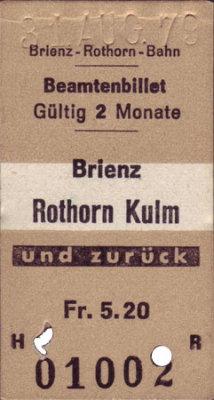 Dieses "Beamtenbillet" wurde für die Saison 1965 gedruckt, aber mit falsch eingestellter Datumspresse ausgegeben (auf der Rückseite findet sich ein entsprechender Vermerk). 1979 verwendete die Brienz-Rothorn-Bahn Datumspressen, welche den Monat als Zahl angeben. Ebenso wäre 1979 "T639" anstelle von "Beamtenbillett" und anstelle des "und zurück" Aufdrucks auf schwarzem Grund wäre 1979 das Doppelpfeil-Symbol verwendet worden.