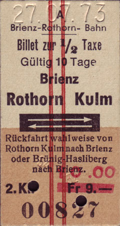Die Bedeutung des Layouts dieser im Juli 1973 genutzten Fahrkarte ist unbekannt. Die zwei vertikalen roten Linien kennzeichneten in der Schweiz üblicherweise Zuschlagsbillette - was hier aber nicht zutrifft. Das "A" im Kopf wurde bei anderen Bahnen für Aktionärsbillette genutzt - die Brienz-Rothorn-Bahn hat ansonsten jedoch "Aktionärbillette" verwendet. Zudem handelt es sich auch um eine "Billett zur 1/2 Taxe", einem Aufdruck der bei Aktionärsbilletten nicht üblich ist.