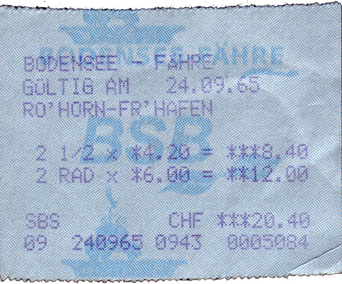 Galerie Schifffahrt Schweiz 3/42 Bodensee: Fahrschein für zwei Personen zum halben Preis und zwei Fahrräder für eine Fahrt mit der Fähre von Romanshorn nach Friedrichshafen. Beim Datum ist mit der Jahresangabe etwas schief gelaufen...