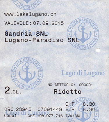 Galerie Schifffahrt Schweiz 19/42 Lago di Lugano: Einfache Fahrt zum ermässigten Preis ("Ridotto") von Gandria nach Lugano-Paradiso. Der Umrechnungsfaktor EUR/CHF war damals gerade 1.00.