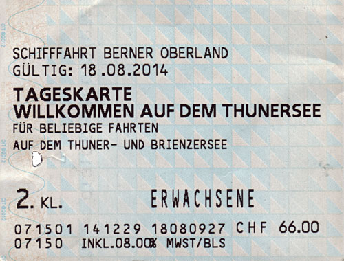 Galerie Schifffahrt Schweiz 31/42 Thunersee, Brienzersee: Obwohl auf dieser Tageskarte fett "Willkommen auf dem Thunersee" steht, gilt sie zur freien Fahrt auf Thuner- und Brienzersee.