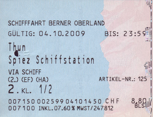 Galerie Schifffahrt Schweiz 33/42 Thunersee: Die BLS betreibt die Schiffe auf beiden Oberländer Seen unter dem Namen Schifffahrt Berner Oberland. Hier ein Billett für einfache Fahrt von Thun nach Spiez Schiffsstation zum Preis für Halbpreis-Berechtigte.