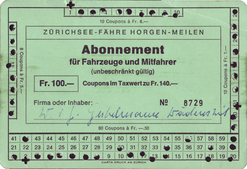Zürichsee: Die Zürichsee-Fähre verkehrt zwischen Horgen und Meilen. Coupon-Abonnement: Entsprechend dem Preis der Überfahrt (Anzahl Personen, Fahrzeugtyp etc.) werden bei jeder Nutzung Felder entwertet. Für CHF 100 konnten mit diesem Abonnement Fahrkarten für insgesamt CHF 140 erworben werden.