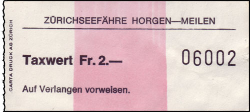 Galerie Schifffahrt Schweiz 39/42 Zürichsee: Zettelbillett der Zürichseefähre zum Taxwert von CHF 2, gedruckt von Carta Druck AG Zürich.