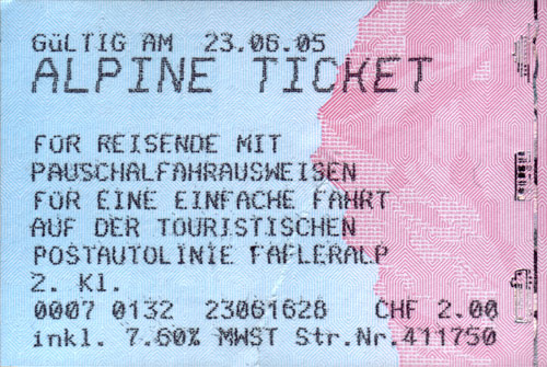 Galerie Alpine Ticket 17/22 Auf der Linie im Lötschental zur Fafleralp wurden nicht die üblichen Postauto-Billettdrucker eingesetzt - entsprechend das spezielle Layout - dafür kam das allgemeine Schweizer-Billettpapier zum Einsatz.