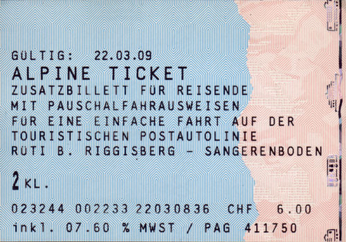 Galerie Alpine Ticket 18/22 Bei diesem Alpine Ticket wurde nicht nur die MWST-Nummer vermerkt, sondern auch ein Kürzel für das zugehörige Unternehmen ("PAG" für Postauto Schweiz AG).