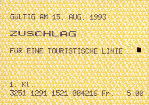Galerie Alpine Ticket 2/22 Bei diesem Zuschlag ist die Begründung für den Zuschlag vermerkt, jedoch nicht die Strecke. Speziell die Angabe "1. Kl." - die Postautos kennen nur eine Klasse.