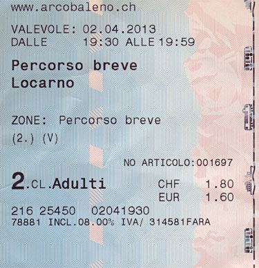 Galerie Tarifverbünde Schweiz 3/24 Arcobaleno: Kurzstreckenbillett. Als Zone ist nochmals "Percorso breve" angegeben, obwohl es sich beim Gültigkeitsbereich nicht um eine Zone sondern um eine Anzahl (Bus-)Haltestellen handelt. Preisangabe in CHF und EUR.