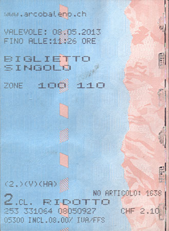 Galerie Tarifverbünde Schweiz 5/24 Arcobaleno: Einzelbillett für zwei Zonen (100, 101; Lugano und Umgebung). Verkauft durch die SBB (FFS).