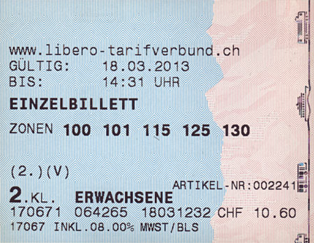 Galerie Tarifverbünde Schweiz 7/24 Libero: Einzelbillett für fünf Zonen (100, 101, 115, 125, 130; von Bern Richtung Südosten) zum Vollpreis. Verkauft durch die BLS.