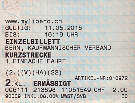 Galerie Tarifverbünde Schweiz 8/24 Libero: Auch im Libero-Verbund gibt es das Kurzstreckenbillett. Ausgegeben von den Städtischen Verkehrsbetrieben Bern (SBV), heute bekannter unter Bern Mobil.