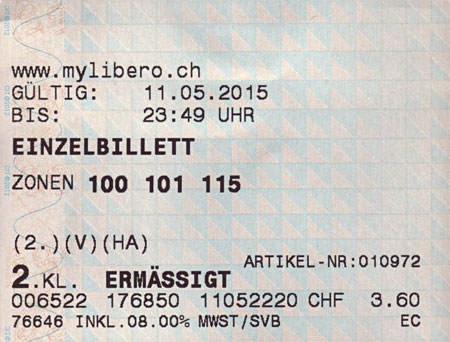 Galerie Tarifverbünde Schweiz 9/24 Libero: Einzelbillett für drei Zonen (100, 101, 115), verkauft durch die Städtischen Verkehrsbetrieben Bern (SBV) und bezahlt mit EC-Karte (Vermerk EC rechts unten).