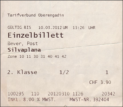 engadin mobil: Dieses Einzelbillett ist speziell: Nur auf der Rückseite ist das Verbund-Logo farbig gedruckt, die Vorderseite ist weiss. Und mit den Zonenangaben scheint etwas schief gelaufen zu sein: Entsprechend der ebenfalls angegebenen Relation Bever Post-Silvaplana müssten nur die drei Zonen 40, 10 und 11 angegeben werden - der Preis des Billetts stimmt auch mit dem damaligen Preis für eine Fahrt in drei Zonen überein. Und ab 7 Zonen - wie ausgewiesen - wäre das Billett ohnehin im ganzen Verbundgebiet gültig.
