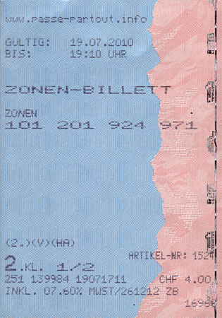 Galerie Tarifverbünde Schweiz 16/24 Passepartout: Einzelbillett für 4 Zonen, ausgegeben von der Zentralbahn (ZB).
