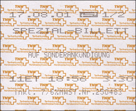 Galerie Tarifverbünde Schweiz 21/24 Tarifverbund Nordwestschweiz: Der Tarifverbund bietet immer wieder Sonderbillette an. Auffällig hier auch das Layout mit Rückfahrtzeichen und Halbpreis-Angabe im Kopf des Billetts.