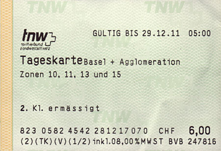 Galerie Tarifverbünde Schweiz 22/24 Tarifverbund Nordwestschweiz: Nach dem Logo-Papier hat der TNW auch noch ein eigenes Sicherheitspapier eingeführt. Tageskarte für die Zonen 10, 11, 13 und 15 (Zone Stadt Basel und angrenzende Zonen; 13 ist die Zone zum Euro-Airport Basel)